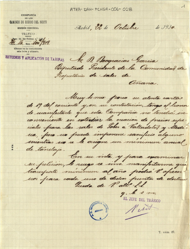Oficio de la Compañía de los Caminos de Hierro del Norte dirigido al Diputado Presidente de la Comunidad de Propietarios de las sales de Añana, Deogracias García, prometiendo estudiar el establecimiento de una tarifa especial para el trasporte de la sal de Pobes a Valladolid, pero no sin antes establecer un mínimo anual de tonelaje
