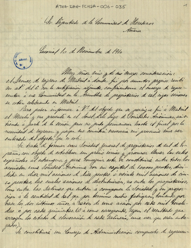 Comunicación de Enrique de Herrán dirigida al Diputado de la Comunidad de Herederos de las salinas de Añana, informándole de los asuntos tratados en la asamblea de propietarios de sales celebrada en Madrid, con objeto de formar una Sociedad General de Propietarios de sal de España