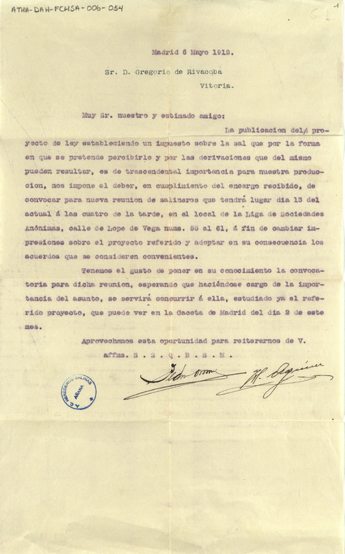Oficio de los representantes de la Sociedad de Salineros de España dirigido a Gregorio de Rivacoba, invitándole a asistir a la reunión que tendría lugar en Madrid próximamente, para tratar el asunto del establecimiento de un impuesto sobre la sal por parte del Gobierno