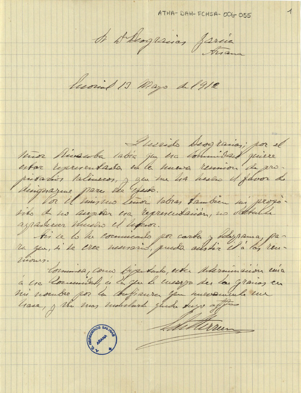 Comunicación de Enrique de Herrán dirigida a Deogracias García, Diputado de la Comunidad de Herederos de las salinas de Añana, haciéndole saber su negativa a asistir a la reunión de la Sociedad de Salineros de España