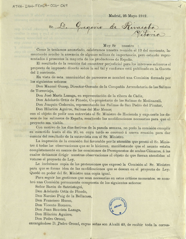Memorandum dirigido a Gregorio de Rivacoba relativo a lo tratado en la última reunión de la Sociedad de Salineros de España