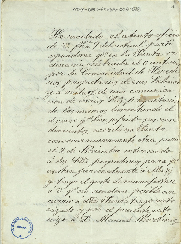 Carta de Antonia del Valle, miembro de la Comunidad de Heredros de las salinas de Añana, dirigida a Enrique de Herrán, autorizando a Manuel Martínez Manzano a representarle en la próxima Junta de dicha Comunidad, ya que le era imposible asistir a la misma