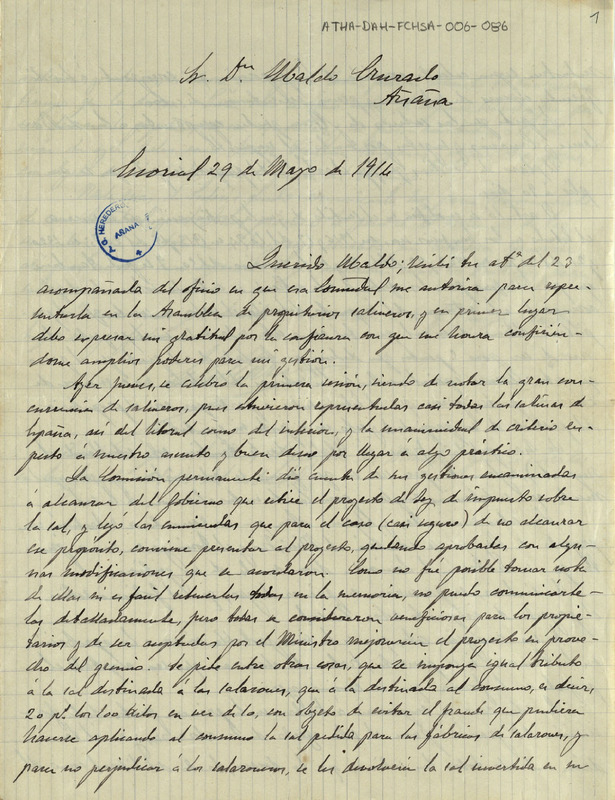 Comunicación de Enrique de Herrán dirigida a Ubaldo Cruzado, informándole de las modificaciones que iban a proponer los salineros de España al Ministro de Hacienda, para la mejora del proyecto de impuesto sobre la sal y la necesidad de creación de la asociación de salineros de España