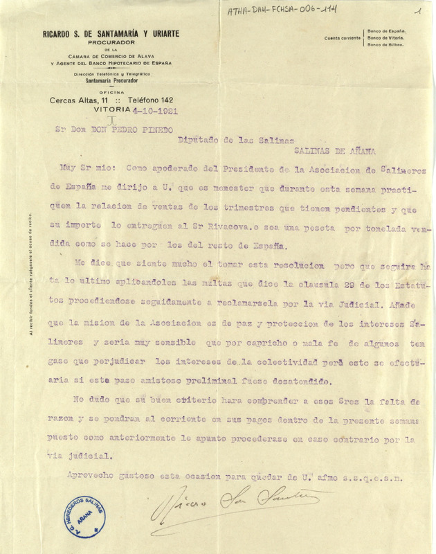 Comunicación de Ricardo Sáenz de Santamaría Uriarte, apoderado del presidente de la Asociación de Salineros de España, dirigido a Pedro Pinedo, Diputado de la Comunidad de Herederos de las salinas de Añana, reclamando el pago de 1 peseta por tonelada de sal impuesta como multa por la Asociación de Salineros de España por no realizar la relación de ventas de varios trimestres