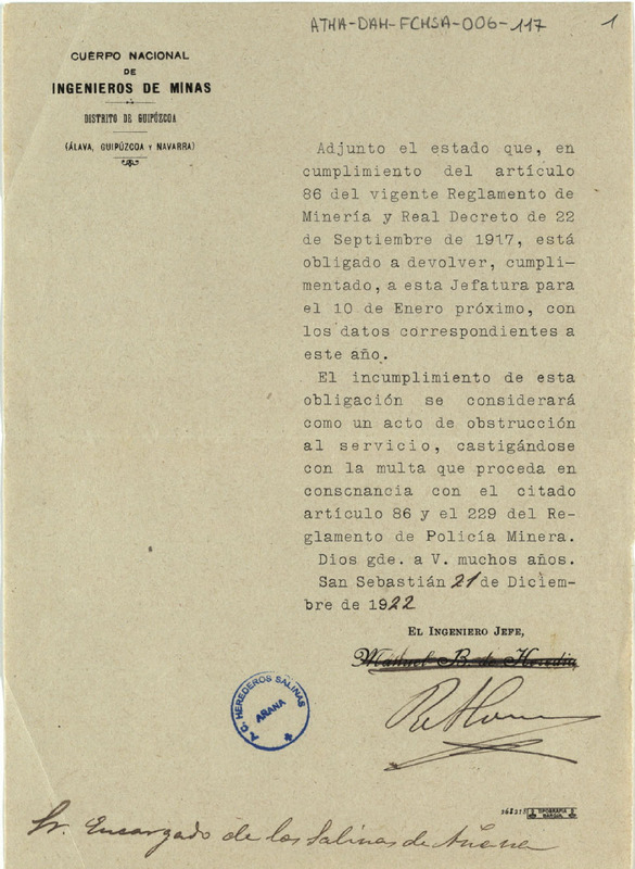 Oficio de Ingeniero Jefe del Distrito minero de Guipúzco, dirigido a la Diputación de Propietarios de Sales de las salinas de Añana, solicitando que se cumplimentara la estadística minera correspondiente al presente año y advirtiendo que el incumplimiento de dicha obligación podría ser castigada con una multa