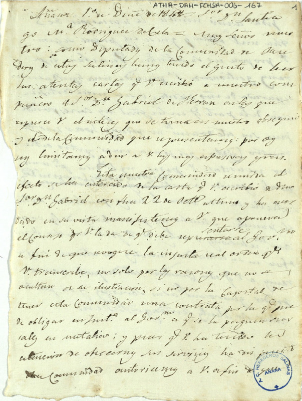 Borrador de una comunicación del Diputado de la Comunidad de Herederos de las salinas de Añana dirigido a Santiago María Rodríguez de Cela, comisionado del Gobierno, agradeciéndole el consejo que les dio sobre la manera de reclamar el pago de de las cantidades que les debía el dicho Gobierno