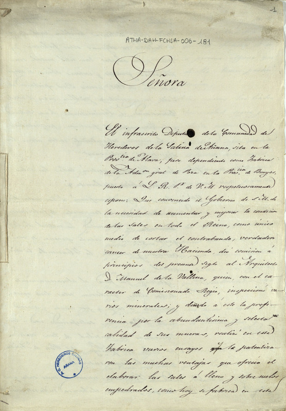 Borrador de una representación de la Comunidad de Herederos de las salinas de Añana dirigida a la Reina, solicitándole que se pagara, por parte de la Hacienda Pública, la fanega de sal a 6 reales y medio en vez de a 4 reales, ya que con el precio actual les llegaba sólo para cubrir gastos, siendo la sal de Añana de primera calidad y que viene desde hace años surtiendo a las provincias de Zamora y Salamanca con el fín de evitar la entrada fraudulenta de sal portuguesa