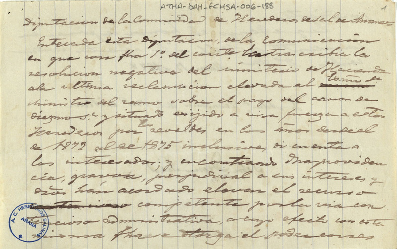 Borrador de un oficio de la Comunidad de Herederos de las salinas de Añana, dirigido al Administrador Económico de la provincia de Álava, informándole de que dicha Comunidad iba a elevar un recurso contencioso administrativo, contra la negativa a condonar el importe del Diezmo Señor y Situado de los años 1872 a 1875, el cual había sido abonado por la fuerza a las tropas carlistas