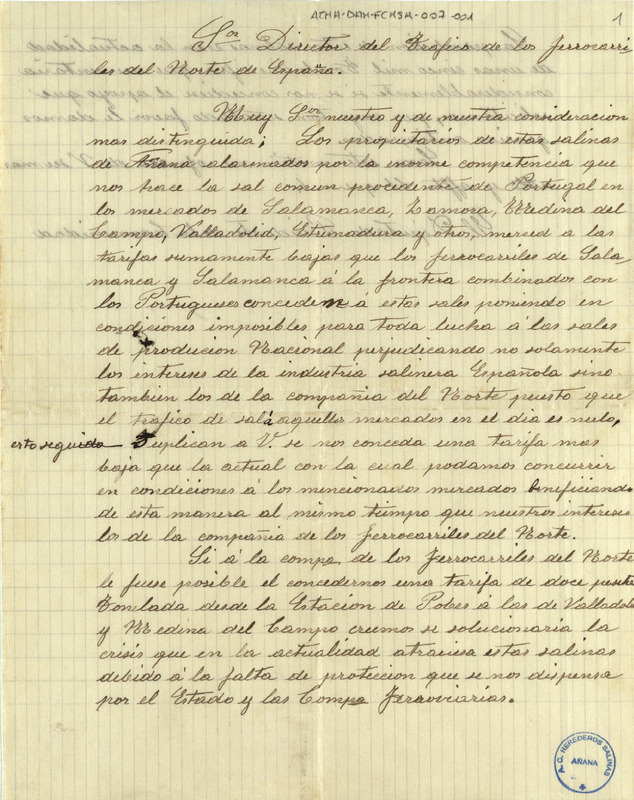 Copia simple de un oficio del Diputado de la Comunidad de Herederos de las salinas de Áñana, dirigida al Director del Tráfico de los Ferrocarriles del Norte, solicitándole una rebaja en la tarifa del transporte de la sal para poder competir con la sal común procedente de Portugal en los mercados de Salamanca, Zamora, Medina del Campo, Valladolid, Extremadura y otros