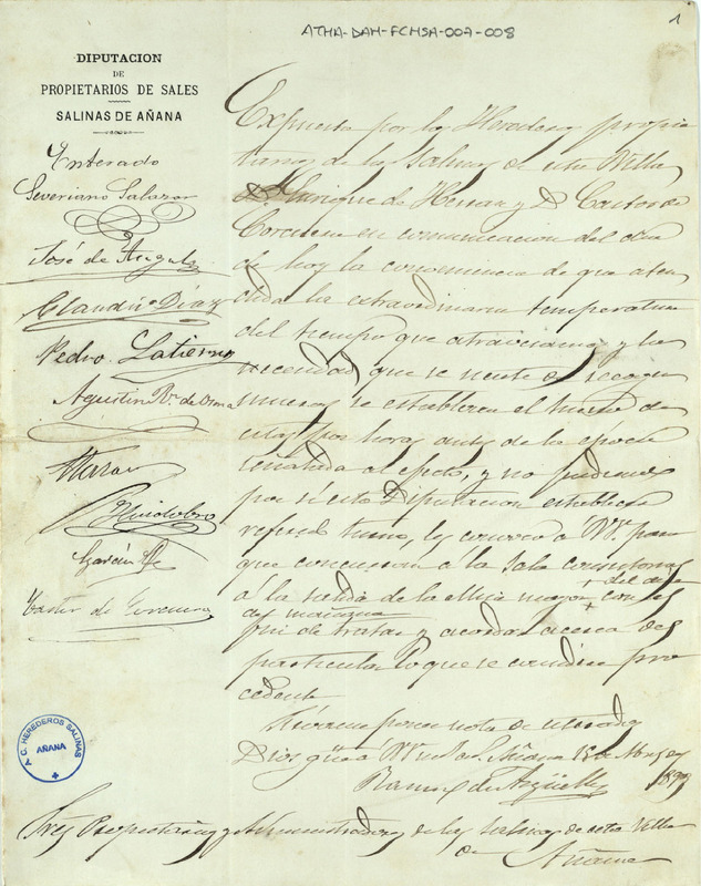 Componentes especiales del documento: 1.- Membrete: "Diputación de Propietarios de Sales. Salinas de Añana"