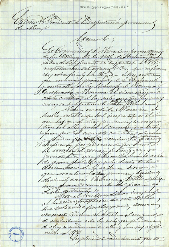 Borrador del oficio de la Comunidad de Herederos Propietarios de las salinas de Añana dirigida al Presidente de la Diputación provincial de Álava, solicitándole se estableciera un impuesto de importación sobre las sales procedentes de otras localidades que se vendieran en la dicha provincia