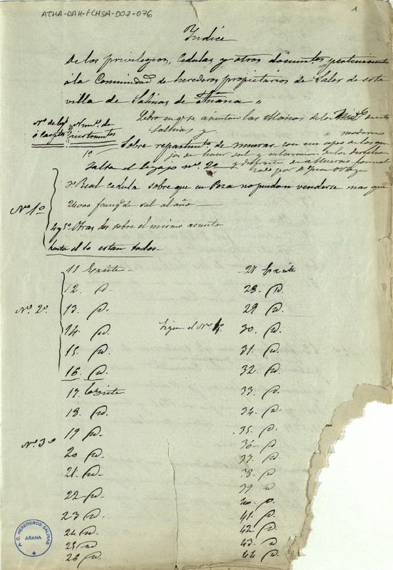 Copia simple de un índice de los privilegios y cédulas, correspondientes a la Comunidad de Herederos Propietarios de Sales delas salinas de Añana
