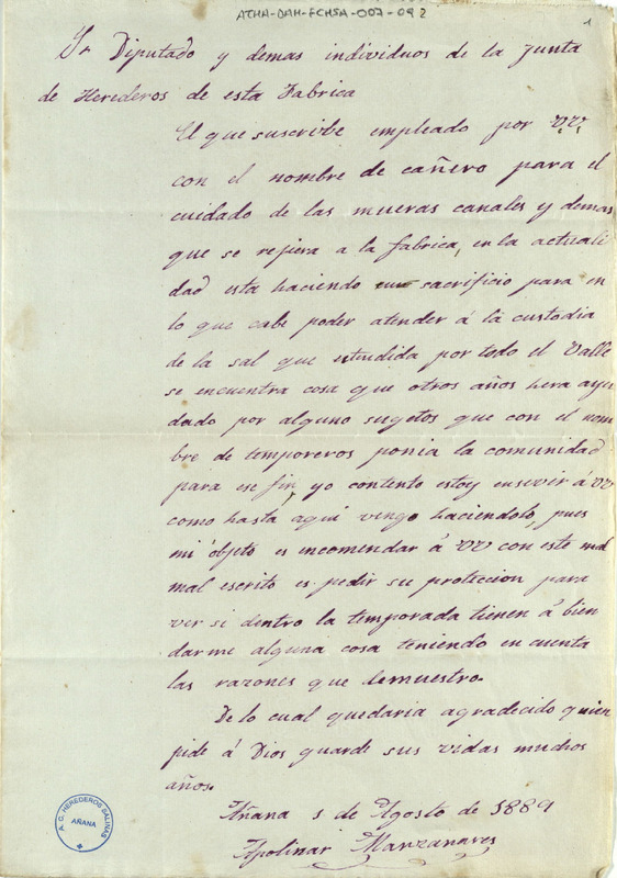 Petición de Apolinar Manzanares, guarda cañero, dirigida al Diputado de la Junta de Herederos de la Fábrica de las salinas de Añana, solicitándole una mejora en sus condiciones laborales
