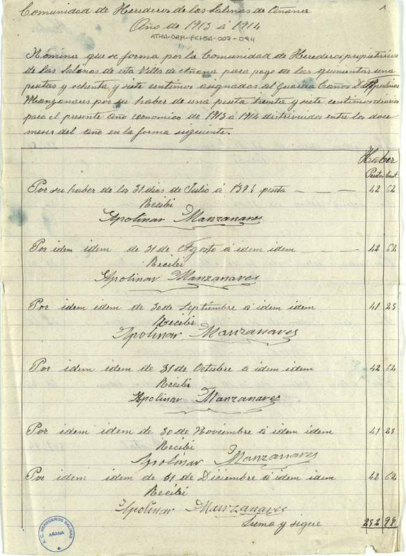 Nómina de 501 pesetas y 87 céntimos asignada por la Comunidad de Herederos Propietarios de las salinas de Añana a Apolinar Manzanares, como guarda cañero, para el año que iba desde julio de 1913 a junio de 1914, con sus recibos mensuales