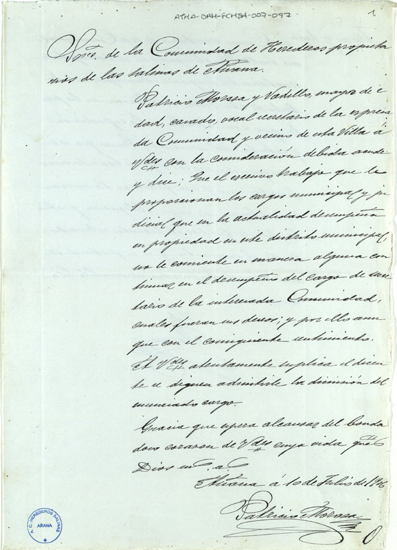 Carta de dimisión del vecino de Salinas de Añana Patricio Moraza Vadillo, como secretario de la Comunidad de Herederos Propietarios de las salinas de la dicha villa