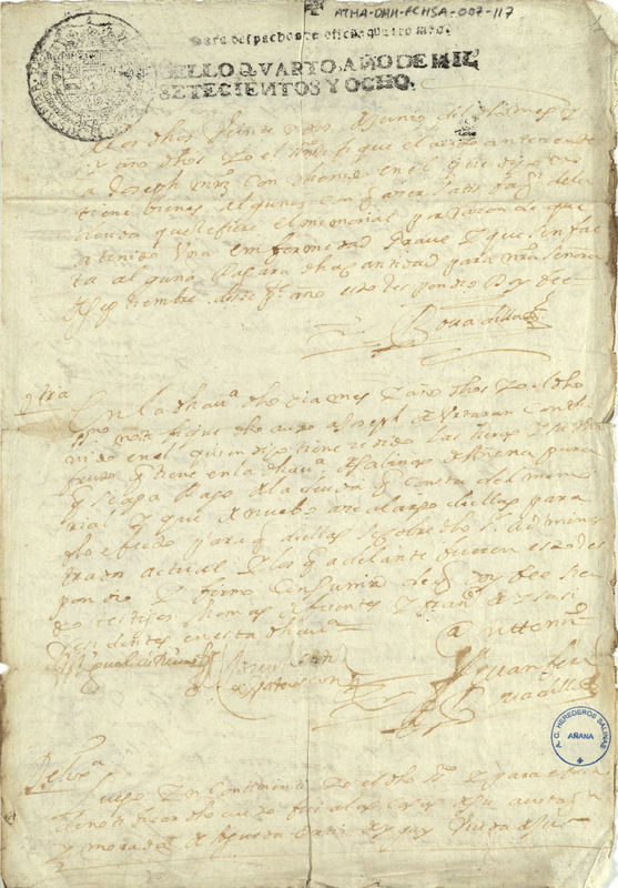Componentes especiales del documento: 1.- Papel sellado: SELLO QUARTO AÑO DE MIL SETECIENTOS Y OCHO