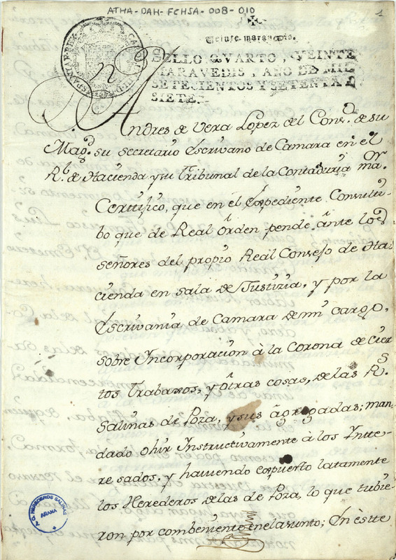 Certificación expedida por Andrés de Vera López, del Consejo Real y su secretario, escribano de Cámara en el Consejo Real de Hacienda y Tribunal y Contaduría Mayor, de las peticiones realizadas por Francisco Luis Garrido, en nombre de Emeterio Javier Hurtado de Corcuera, apoderado, a su vez, de la Comunidad de Herederos de las salinas de Añana, para que se le entreguen los autos de incorporación de las salinas de Poza de la Sal y otras, a la Corona