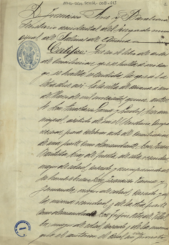 Certificado, realizado por Francisco Arce Barahona, de un acta de conciliación realizada el 1 de marzo de 1915, en el pleito seguido por Juan Bautista Díaz de Tuesta, en nombre de la Comunidad de Herederos de las salinas de Añana, contra Trifón Ortiz de Villalba, vecino de dicha villa, sobre el cumplimiento de las condiciones contractuales del arrendamiento de la saca de tierra
