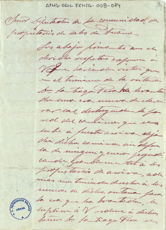 Instancia de Guillermo Fernández, Anastasio Loma e Hipólito Sáez, dirigida al Diputado de la Comunidad de Herederos de las salinas de Añana, solicitando que se ordenara a Santiago Pera la reconstrucción de una pared derribada por él, en la construcción de una era de hacer sal en el término de La Ontana