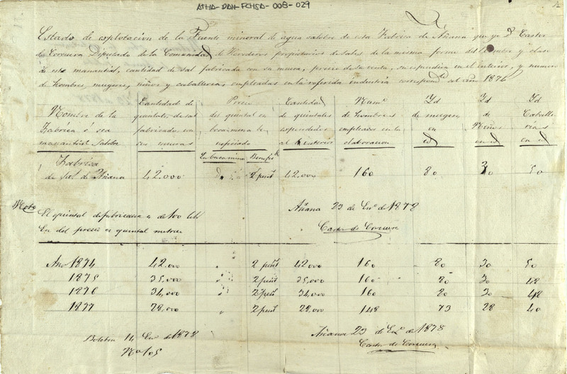 Relación formada por Cástor Corcuera, como Diputado de la Comunidad de Herederos de las salinas de Añana, del estado de la explotación de la fuente mineral de agua salobre de la fábrica de Añana, desde 1874 a 1877, con expresión del nombre y clase de este manantial, cantidad de sal fabricada con su muera, precio de su venta y número de hombres, mujeres, niños y caballerías empleados en la industria