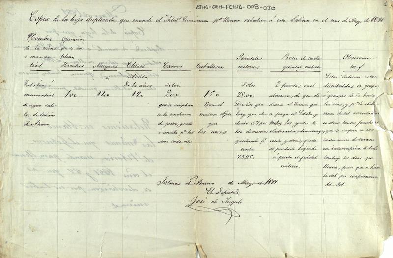 Copia de la hoja enviada por el Administrador Económico de la Provincia de Álava, para su cumplimetación por parte de la Comunidad de Herederos de las salinas de Añana, con la estadística de sal y los medios utilizados para su estracción durante el mes de mayo del año 1881