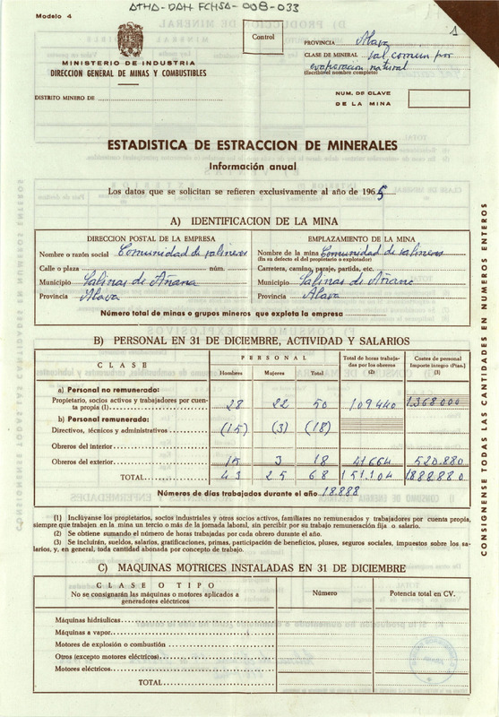 Impreso estadístico del Ministerio de Induastria, Dirección General de Minas y Combustibles, de la actividad desarrollada por la Comunidad de Salineros de las salinas de Añana en 1965, en la extracción de sal común por evaporación natural