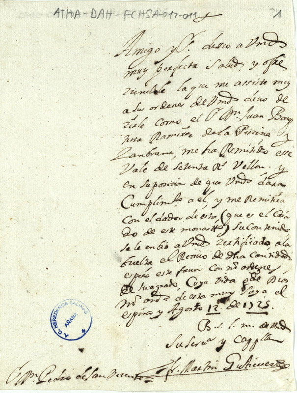 Comunicación de Martín Gutiérrez, capellán, dirigida a Pedro de San Vicente, Administador de las Reales Salinas de Añana, solicitando que se hiciera efectivo el vale de 60 reales de vellón que tenía en su poder