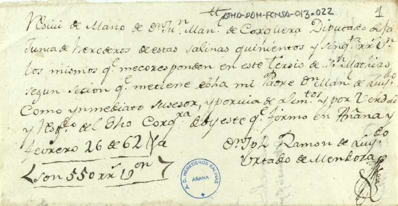 Recibo de 550 reales de vellón otorgado por José Ramón de Luyando Hurtado de Mendoza en favor de Juan Manuel de Corcuera, Diputado de la Comunidad de Herederos de las salinas de Añana, por el tercio de San Matías que le había cedido Manuel de Luyando, su padre