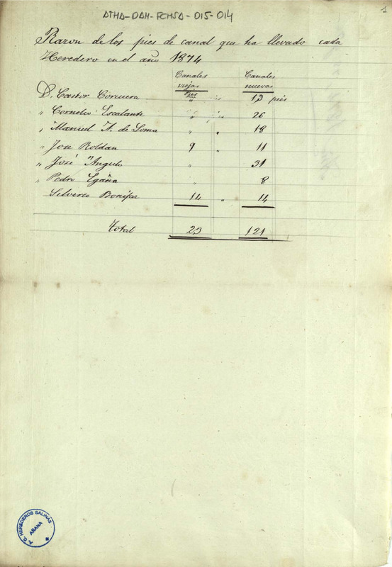 Cuenta de los pies de canales usados por los miembros Comunidad de Herederos de las salinas de Añana durante el año 1874