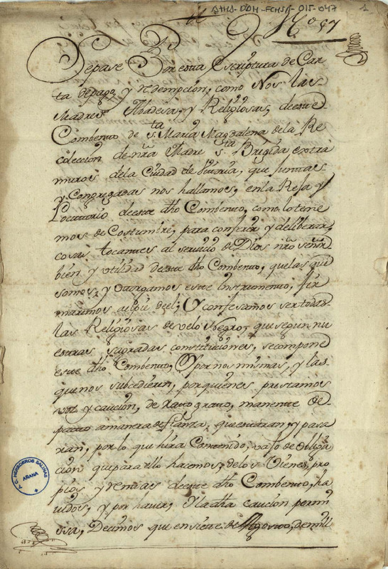 Carta de pago de 7.800 reales de vellón, por los que se redimía de la mitad de un censo de 15.000 reales de principal que corría contra la junta de Herederos de las salinas de Añana, otorgada por la abadesa y religiosas del convento de Santa María Magdalena de Vitoria, en favor de la expresada Junta y en su nombre Vicente de Argüelles