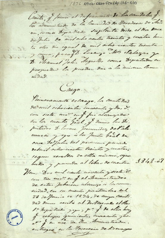 Cuenta otorgada por el Diputado suplente de la Comunidad de Herederos de las salinas de Añana Adrián de Herrán, comenzada 11 de julio de 1834 hasta el mismo día de 1835, arrojando un resultado a favor de 496 reales y 10 maravedíes