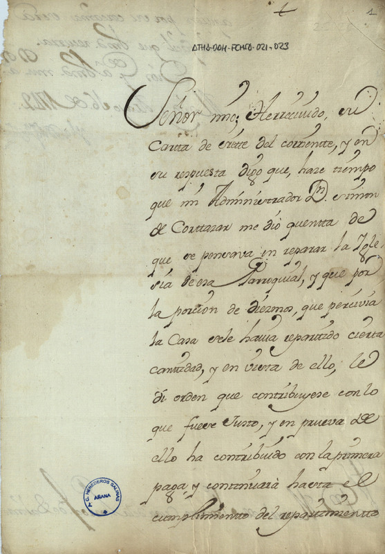 Carta de la Condesa de Salinas dirigida a Manuel de Fontecha, cura de la iglesia parroquial de Salinas de Añana, comunicando haber mandado a su administrador Simón Cortázar su contribución justa al pago de las obras de la iglesia de Salinas de Añana