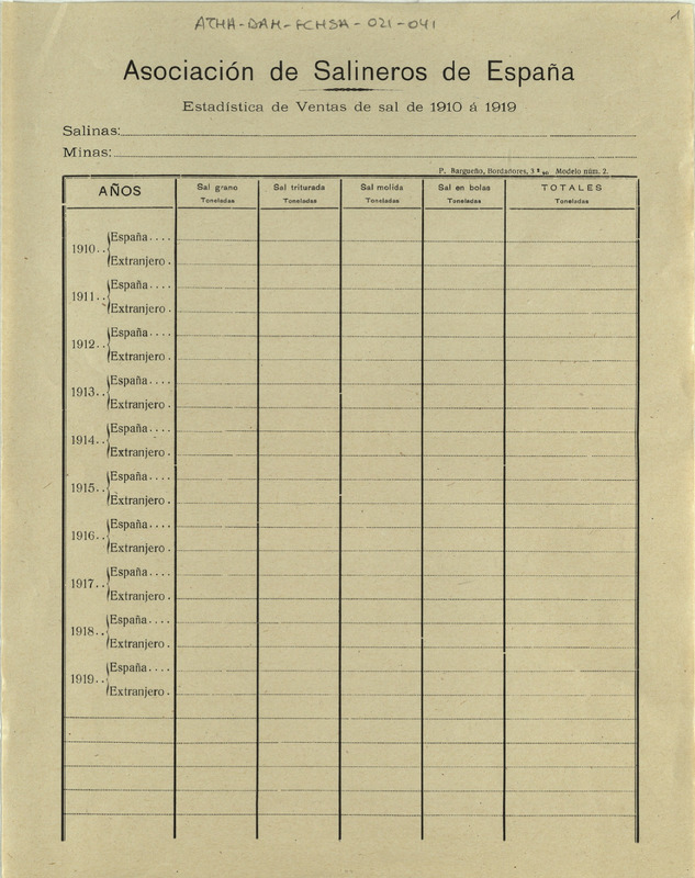 Impreso del modelo de estadística de ventas de sal de 1910 a 1919 de la Asociación de Salineros de España