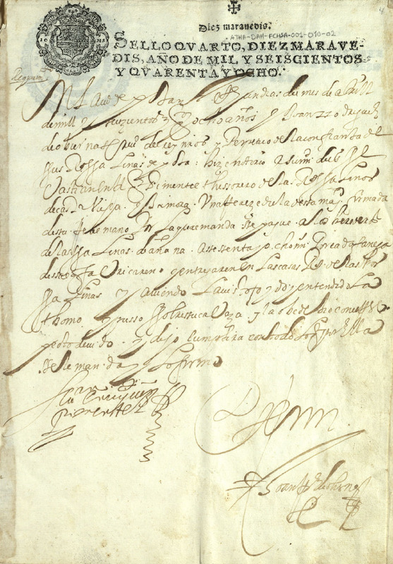 Componentes especiales del documento: 1.- Papel sellado Felipe IV. Sello de tinta negra. Escudo de España bajo corona. SELLO QUARTO, DIEZMARAVEDIS, AÑO DE MIL Y SEISCIENTOS Y QUARENTA Y OCHO