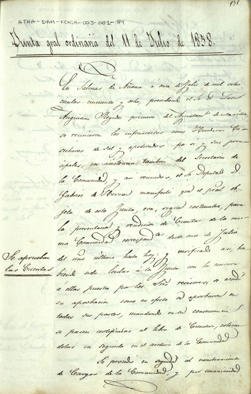 Acta de la Junta General ordinaria de la Comunidad de Herederos de las salinas de Añana del 11 de julio de 1858