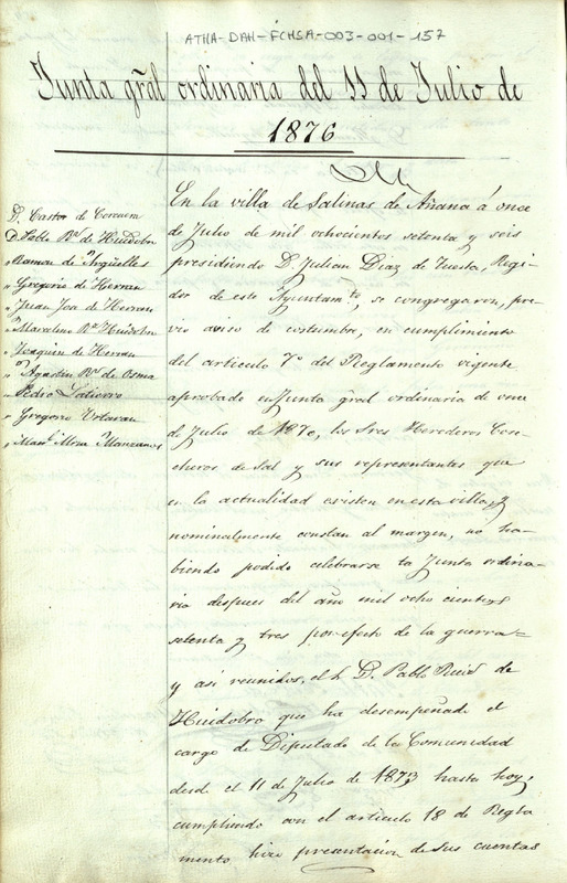 Acta de la Junta General ordinaria de la Comunidad de Herederos Cosecheros de sal de Añana del 11 de julio de 1876