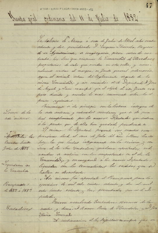 Acta de la Junta General ordinaria de la Comunidad de Herederos Propietarios de sales de Añana del 11 de julio de 1882
