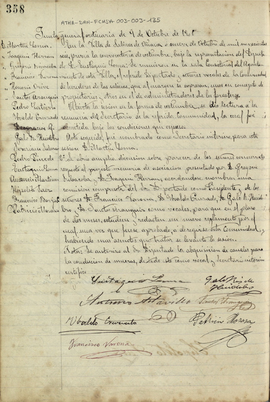 Relación de asuntos:\n1.- Toma de razón de la renuncia del secretario de la Comunidad de Herederos, acordándose que fuera admitida\n2.- Nombramiento de Martín Loma como secretario accidental para la presente sesión\n3.- Discusión sobre el proyecto de asociación presentado por Gregorio Rivacoba y Joaquín de Herrán, acordándose que se nombrara comisión compuesta por Eustaquio Loma, Francisco Varona, Ubaldo Cruzado, Galo Ruiz de Huidobro y Santos Aránguiz, para que estudiaran y redactaran un nuevo reglamento por el cual había de regirse la Comunidad de Herederos\n4.- Acuerdo por el cual se autorizaba al Diputado de la Comunidad de Herederos para la adquisición de canales para la conducción de las mueras