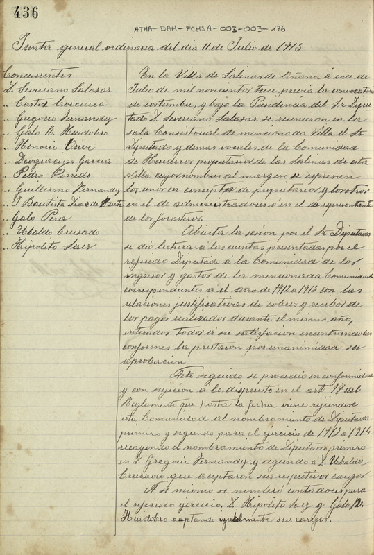 Relación de asuntos:\n1.- Toma de razón de las cuentas de la Comunidad de Herederos de las salinas de Añana desde el 11 de julio de 1912 hasta el mismo día del presente año, acordándose que fueran aprobadas\n2.- Nombramiento de Gregorio Fernández como Diputado de la Comunidad de Herederos y de Ubaldo Cruzado como su Teniente\n3.- Nombramiento de Hipólito Sáez y Galo Ruiz de Huidobro, como contadores de la Comunidad de Herederos\n4.- Acuerdo por el cual se disponía que se girara un reparto para recomponer los canales y se nombrara una comisión compuesta por Gregorio Fernández, Cástor Corcuera, Galo Ruiz de Huidobro y Juan Bautista Díaz de Tuesta, para que examinaran el arroyo de Quintana debido a las quejas que existían sobre la chaveta del mismo