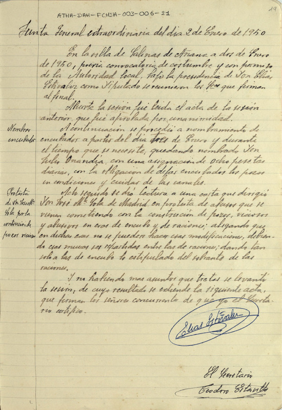 Acta de la Junta General extraordinaria de la Comunidad de Herederos de las salinas de Añana de 2 de enero de 1950