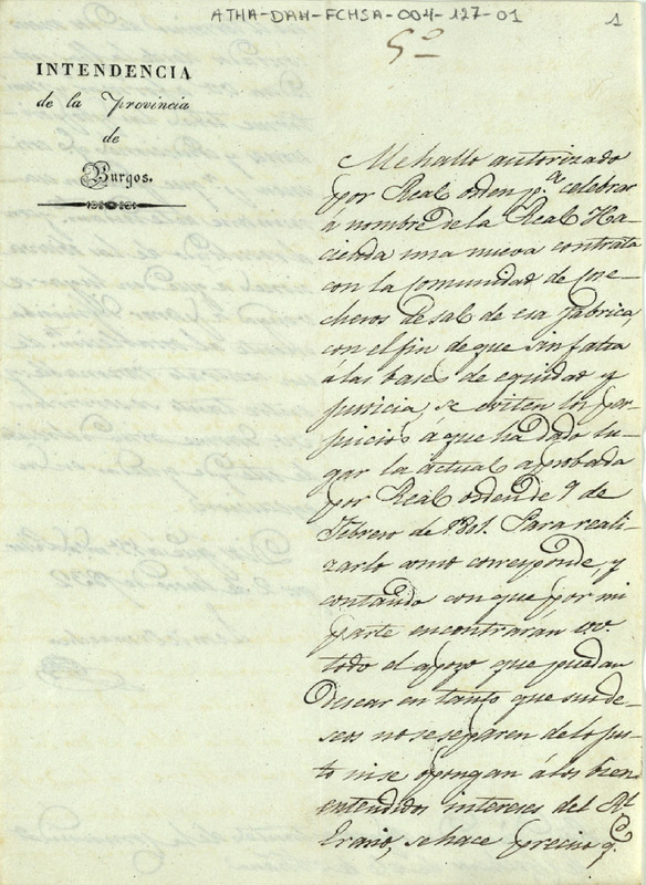Oficio del Intendente de Burgos, León Ormaechea, dirigido a los Diputados de la Comunidad de Herederos de las salinas de Añana, notificando que se hallaba autorizado para celebrar una nueva contrata, con la citada Comunidad, en nombre de la Real Hacienda, para evitar los perjuicios a que ha dado lugar la actual, aprobada por Real orden de 9 de febrero de 1801, y que en dos meses debían mandar sus propuestas