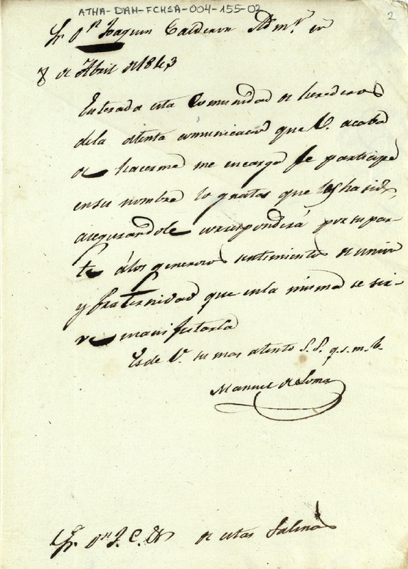 Oficio de Manuel de Loma como Diputado de la Comunidad de Herederos de las salinas de Añana dirigido a Joaquín Calderón, dándose por enterado del nombramiento del cargo de Administrador de la expresada salina