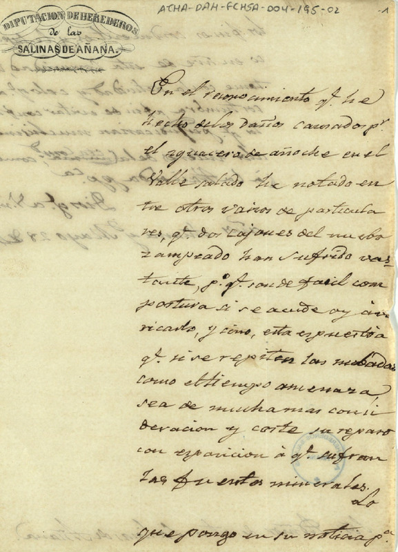 Borrador del oficio del Diputado de la Comunidad de Herederos de las salinas de Añana, dirigido a la Administración de la Fábrica de Salinas de Añana, notificando los daños causados, por el aguacero acaecido en la noche del día anterior en el Valle Salado, a dos cajones del nuevo zampeado, y proponiendo su arreglo antes de que el coste fuese mayor