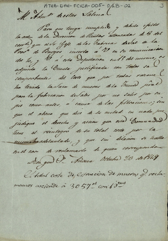 Borrador del oficio del Diputado de la Comunidad de Herederos de Salinas de Añana dirigido a la Administración de la Salina de Añana, haciéndole constar los 3.057 reales y 18 maravedíes de los gastos que se habían causado por la saca, a brazo, de la muera de la fuente principal, para que se lo hiciera saber al Jefe de las Fábricas de Sal de la provincia de Burgos