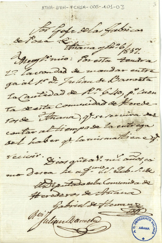 Oficio de Gabriel de Herrán como Diputado de la Comunidad de Herederos de las salinas de Añana, dirigido al Jefe de las Fábricas de sal de Poza, solicitándole que entregara a Julián de Barrueta, la cantidad de 640 reales pertenecientes a dicha comunidad