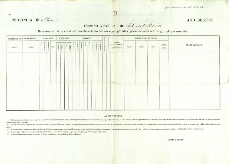Pliego del padrón del censo de estadística mineral de Salinas de Añana para su cumplimentación