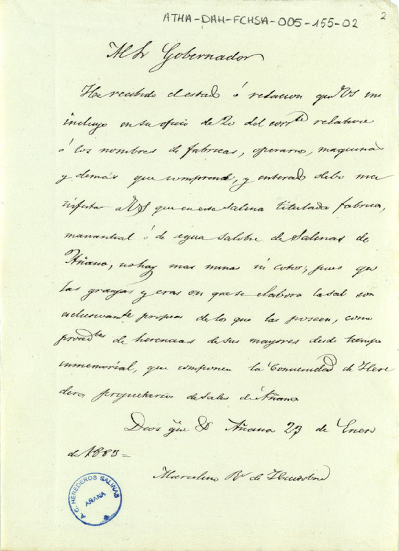 Oficio de Marcelino Ruiz de Huidobro, dirigido al Gobierno de la Provincia de Álava, comunicándole que en dichas salinas no había minas, ni cotos, y que todas las granjas y eras usadas para la elaboración de sal pertenecían a sus dueños por herencia de sus mayores