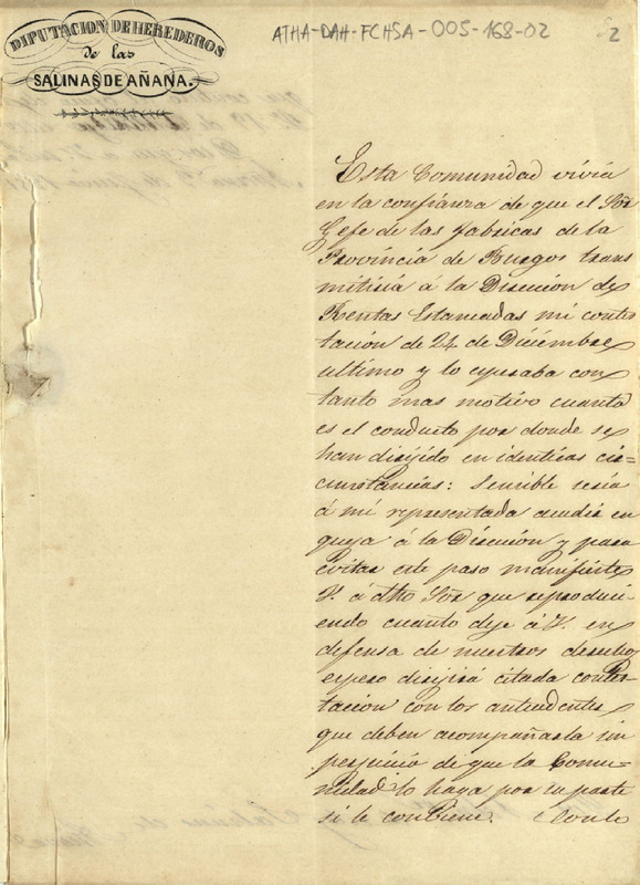 Componentes especiales del documento: 1.- Membrete: "Diputación de HErederos de las salinas de Añana"