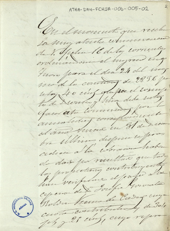 Borrador del oficio de la Comunidad de Herederos de las Salinas de Añana dirigido a la Administración Especial de Hacienda de Álava, exponiendo las razones por las que no había realizado el pago de los 2.836,40 pesetas en concepto de Diezmo Señor y Situado correspondiente al año 1900