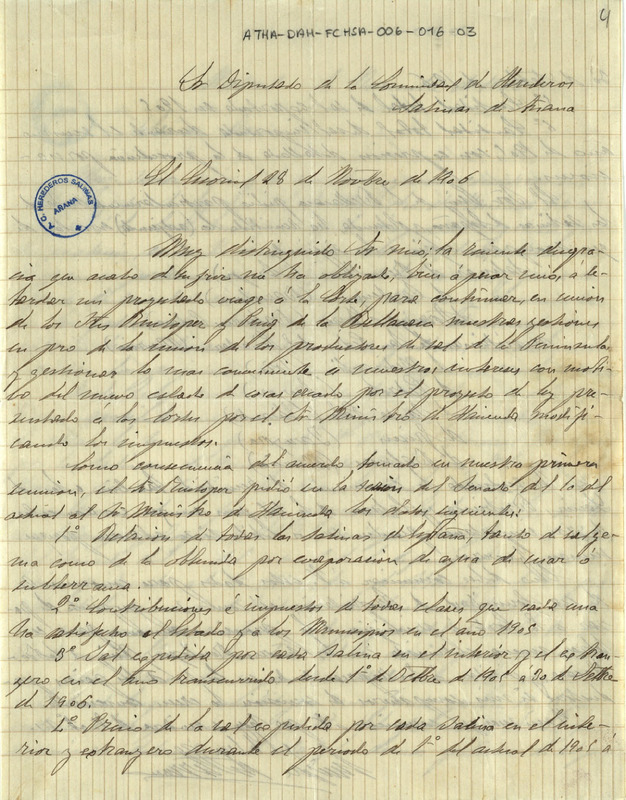 Comunicación de Enrique de Herrán a la Comunidad de Herederos de las salinas de Añana, relativa a las gestiones realizadas ante el Ministro de Hacienda, para la modificación de los impuestos sobre la sal, ya que estos eran totalmente perjudiciales para el sector